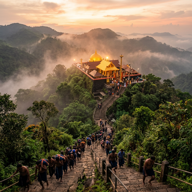 Nestled in the Western Ghats, Sabarimala is one of the largest annual pilgrimages in the world. The temple is dedicated to Lord Ayyappa and is famous for the Makaravilakku festival.